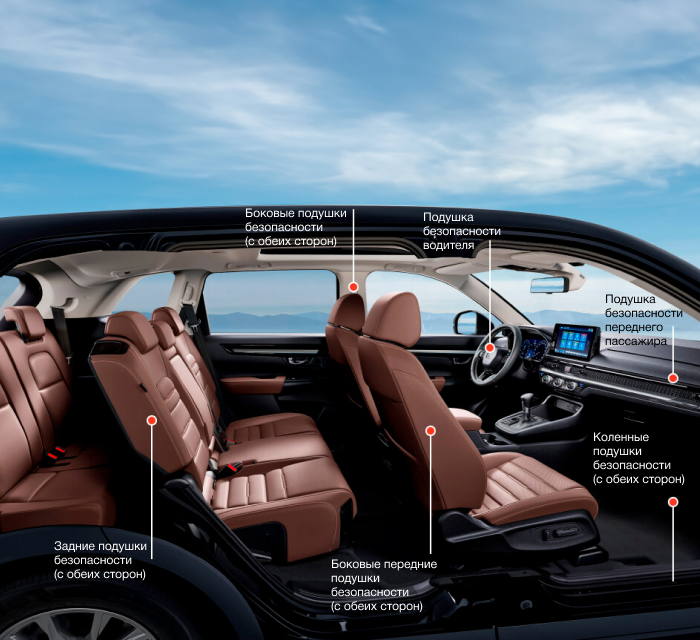 Все комплектации Honda CR-V оснащены 10-ю подушками безопасности, включая боковые и коленные, которые при столкновении, боковом наезде или опрокидывании смогут эффективно обеспечить безопасность водителя и пассажиров.